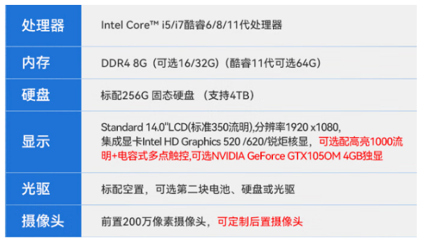 顯示以及顯卡:Standard14.0"LCD(標準350流明)分辨率1920x1080集成顯卡IntelHDGraphics520/620/銳炬核顯,可選配高亮1000流明+電容式多點觸控可選NVIDIAGeForceGTX105OM4GB獨顯