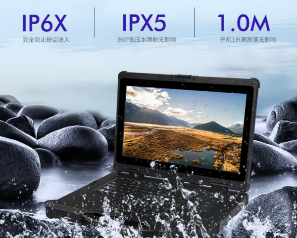 這款三防加固筆記本采用了軍工級別的材質(zhì),具有良好的抗跌落、抗沖擊和耐腐蝕性。其四周都設(shè)計了防撞角,以進一步保護筆記本免受外部沖擊。此外,它還達(dá)到了IP65級防護,整機完全防塵,并可以360度防噴射水侵入。即使在戶外作業(yè)時遇到暴雨等惡劣天氣,您也不用擔(dān)心筆記本受損。只需將機身上的水擦干,機器仍可正常運行。