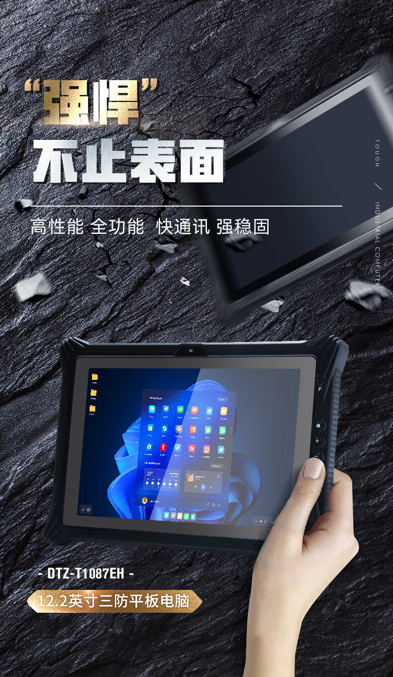型號(hào):DTZ-T1087EH,概述:東田三防12.2英寸三防平板,便攜式加固平板,12.2英寸高清觸摸屏,10點(diǎn)G+G電容屏,650nit亮度,可在戶外陽(yáng)光下可視工作。